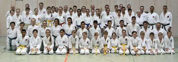 Danach startete die Trainingseinheit für die Schüler bis zum 6. Kyu. Hier wurde die Bunkai Heian Nidan (Ruhe und Frieden 2. Grad) trainiert. Bunkai bedeutet die Analyse und die praktische Anwendung der Techniken einer Kata mit einem oder mehreren Partnern. Und auch hier wurden die Schüler, unsere Kader-Athleten, sowie die Trainer gefordert. Bei der letzten Trainingseinheit ab dem 5. Kyu bis Dan wurden die Katas Tekki Shodan (eiserner Reiter Stufe 1) und Tekki Nidan (eiserner Reiter Stufe 2) trainiert. Unser Trainer Sensei Andra Ziza mischte die beiden Katas, so dass immer ein Angriff der Tekki Nidan auf den Angriff der Tekki Shodan folgen musste. Dies fordert eine hohe Konzentration für solch ein komplexes Training.