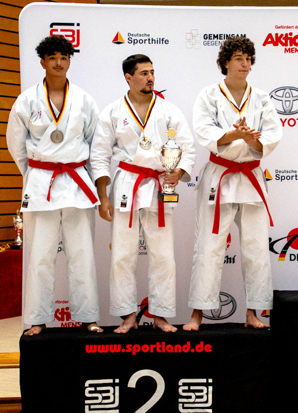 Am 18.09. fanden in Berlin die deutschen Meisterschaften der Leistungsklasse statt. Constantin Gschwind und Egor Schröder starteten in er Kategorie Kata Einzel und konnten sich beide leider nicht durchsetzen. Das Kata-Team, Rayan Ziza, Egor Schröder und Constantin Gschwind kämpfte sich jedoch erfolgreich gegen starke Konkurrenten ins Finale und konnten am Ende den 2.Platz mit Silber belegen. Mit Silbermedaillen und Pokal traten die 3 die Heimreise an. Ein besonderer Dank gilt unserem Trainer Sensei Andra Ziza, der die 3 trainiert, motiviert und immer vor neue Herausforderungen stellt.