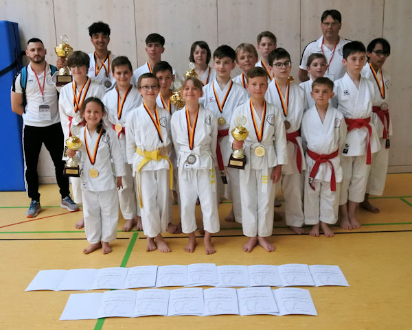Es war ein Tag nicht nur geprägt von persönlicher Hilfsbereitschaft, sondern auch von vielen Eindrücken. Wie zum Beispiel von unseren Kleinsten in der Altersklasse U8, von denen viele zum ersten Mal auf einer Kampffläche standen und die trotzdem eine coole und erstaunlich routinierte Darbietung geliefert haben. Von Kindern, die mit Pokal, Urkunde und Rose in den Händen nicht wussten, wie sie vom Siegertreppchen herunterkommen sollten und deswegen kurzerhand heruntergehoben wurden. Von den erfahrenden Jugendlichen, die komplexen Katas Kraft und Ausdruck verliehen. Von Kata Teams, die synchron funktionierten und im zweiten Teil ihrer Disziplin immer wieder spektakuläre Bunkai präsentierten. Darauf können nicht nur die Karatekas selbst, sondern auch die Eltern und auch der Verein stolz sein.