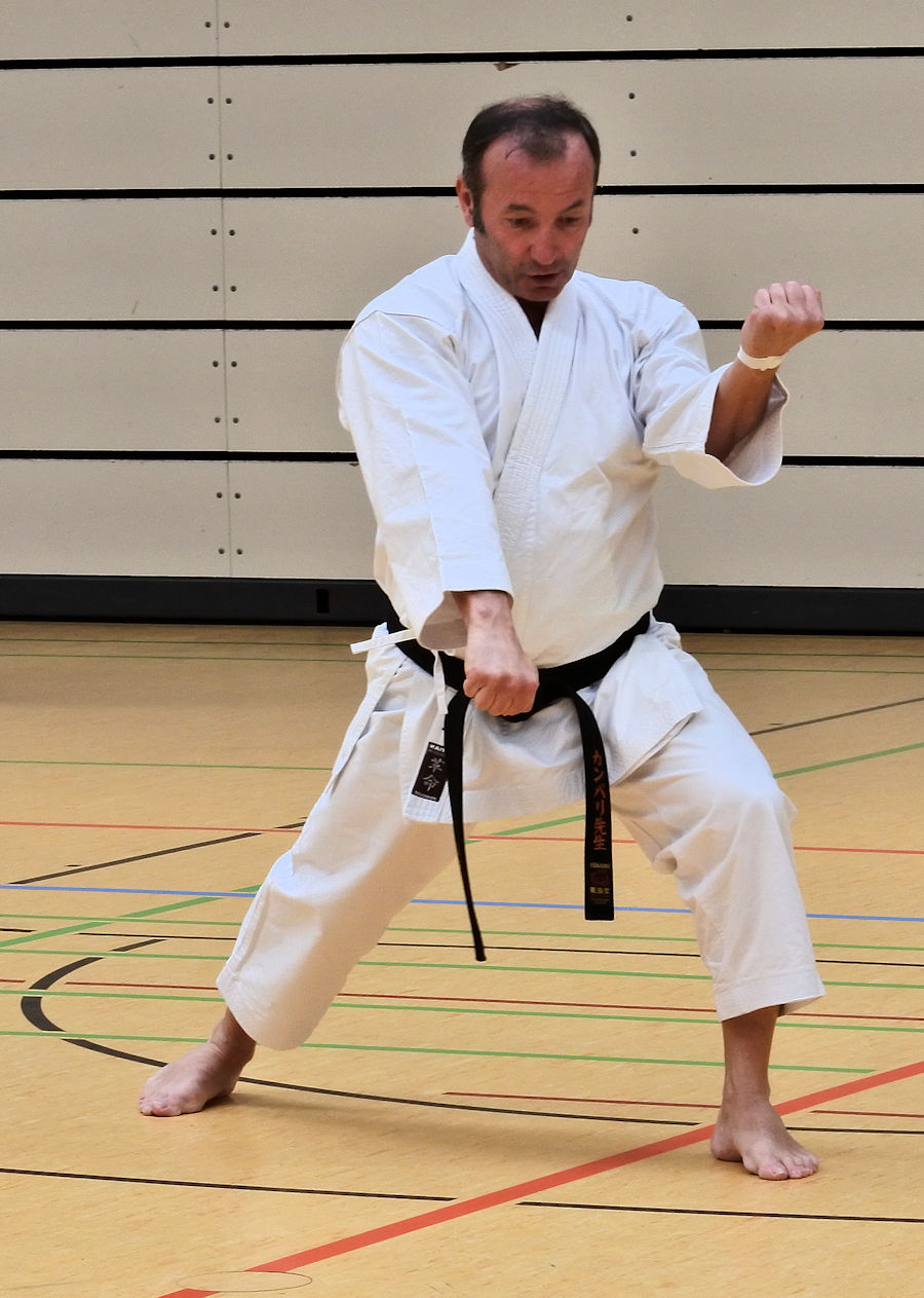 Die Kata Heian Shodan wurde für die Lehrgangsteilnehmer vom 9. – 7. Kyu zuerst im Stand trainiert. Anschließend wurde die Form abgewandelt und die Kata auf einer Linie trainiert, um danach wieder abgewandelt zu werden und nur noch auf 1qm stattfand. Auch die Bunkai, sowie das Kumite in 4 Richtungen wurden in den 2 Trainingseinheiten für die Schüler aufbereitet und sehr gut vermittelt.