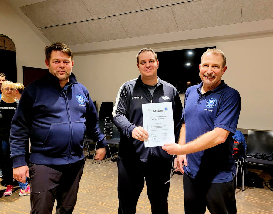 Daher nutzten unseren beiden SV Trainer, Markus Schmock und Volker Albrecht gerne die Gelegenheit den Feuerwehrleuten nützliche Tipps für solche Situationen zu geben. Wie wir feststellen konnten sind die unter dem Wehrführer Herrn Andreas Leingang stehenden Frauen und Männer wirklich eine starke Truppe. Wir übten verschiedene Situationen, die bei der Konfrontation mit Störern entstehen können, bis hin zur robusten Abwehr von Angriffen.