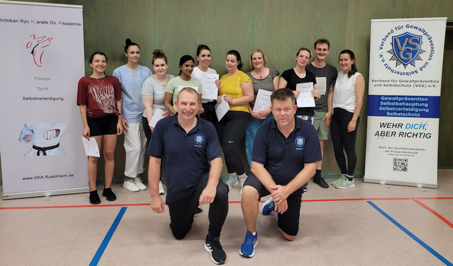 Zum zweiten Mal durften wir Pflegekräfte im Klinikum Karlsruhe, die in der Psychiatrie beschäftigt sind, unterstützen. Die Pflegekräfte führten bereits ein Gewaltpräventionstraining durch, ebenso absolvierten sie ein Deeskalationstraining. Jedoch bestand eine Lücke im Bereich der Selbstbehauptung. Unsere beiden Trainer, Markus Schmock und Volker Albrecht, übten mit den Pflegekräften das Verhalten in Bedrohungssituationen und den entsprechenden Selbstschutzmaßnahmen. Es ist ein schwieriges Unterfangen, Menschen, die gewohnt sind anderen zu helfen, Übungen zu zeigen, die teilweise robust sind.
