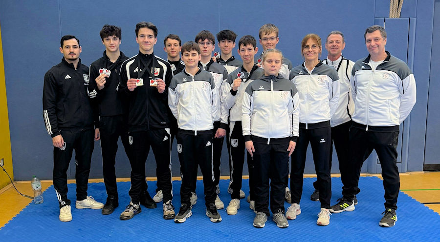 Im Team-Wettbewerb bewiesen unsere Athleten zudem großen Zusammenhalt. Das Team mit Niklas Küster, Leandro Kessel und Jonas Sieg zeigte eine geschlossene Leistung und holte sich die Bronzemedaille. In derselben Kategorie erkämpfte sich das Team mit Fabio Münch, Arian Boland Bakhsh und Janne Wankmüller einen hervorragenden 2. Platz – ein starkes Zeichen für Teamgeist und Harmonie auf der Fläche.